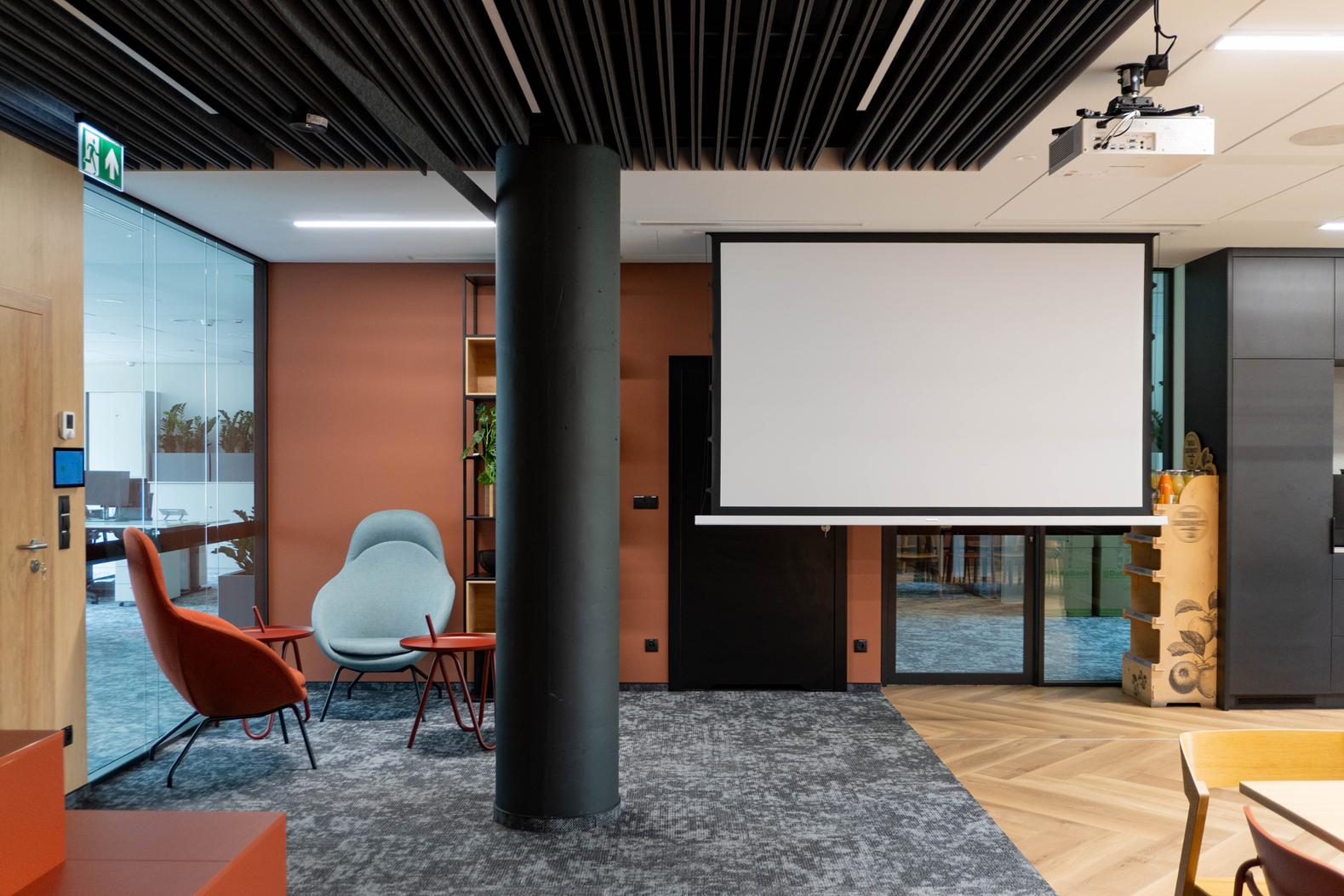 Wspólna strefa w kuchni została wyposażona w system AV wspierający prezentacje i komunikację firmową. Główna sala konferencyjna umożliwia prowadzenie efektywnych spotkań z klientami i partnerami na całym świecie. Mniejsze sale zapewniają szybki i wygodny dostęp do funkcji wideokonferencyjnych, a system rezerwacji z ekranami przydrzwiowymi usprawnił organizację pracy całego biura.